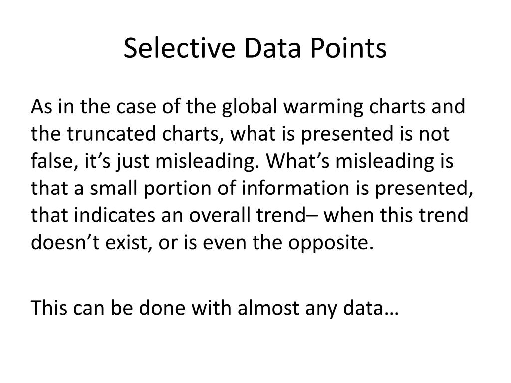 Selective Data Points As in the case of the global warming charts and the truncated charts, what is presented is not false, it’s just misleading. What’s misleading is that a small portion of information is presented, that indicates an overall trend– when this trend doesn’t exist, or is even the opposite. This can be done with almost any data…