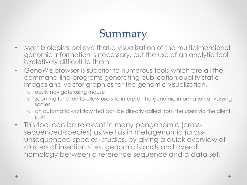 Summary • Most biologists believe that a visualization of the multidimensional genomic information is necessary, but the use of an analytic tool is relatively difficult to them. • GeneWizbrowser is superior to numerous tools which are all the command-line programs generating publication quality static images and vector graphics for the genomic visualization. • easily navigate using mouse • zooming function to allow users to interpret the genomic information at varying scales • an automatic workflow that can be directly called from the users via the client part • This tool can be relevant in many pangenomic (cross-sequenced-species) as well as in metagenomic (cross-unsequenced-species) studies, by giving a quick overview of clusters of insertion sites, genomic islands and overall homology between a reference sequence and a data set.