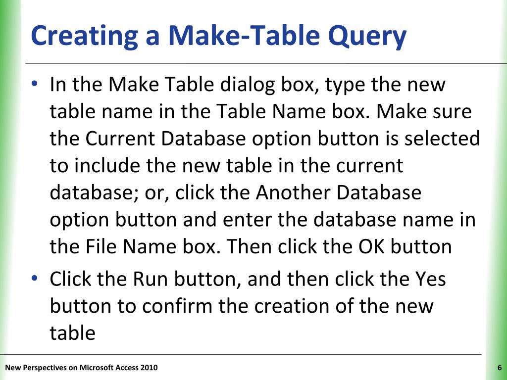 Creating a Make-Table Query • In the Make Table dialog box, type the new table name in the Table Name box. Make sure the Current Database option button is selected to include the new table in the current database; or, click the Another Database option button and enter the database name in the File Name box. Then click the OK button • Click the Run button, and then click the Yes button to confirm the creation of the new table New Perspectives on Microsoft Access 2010