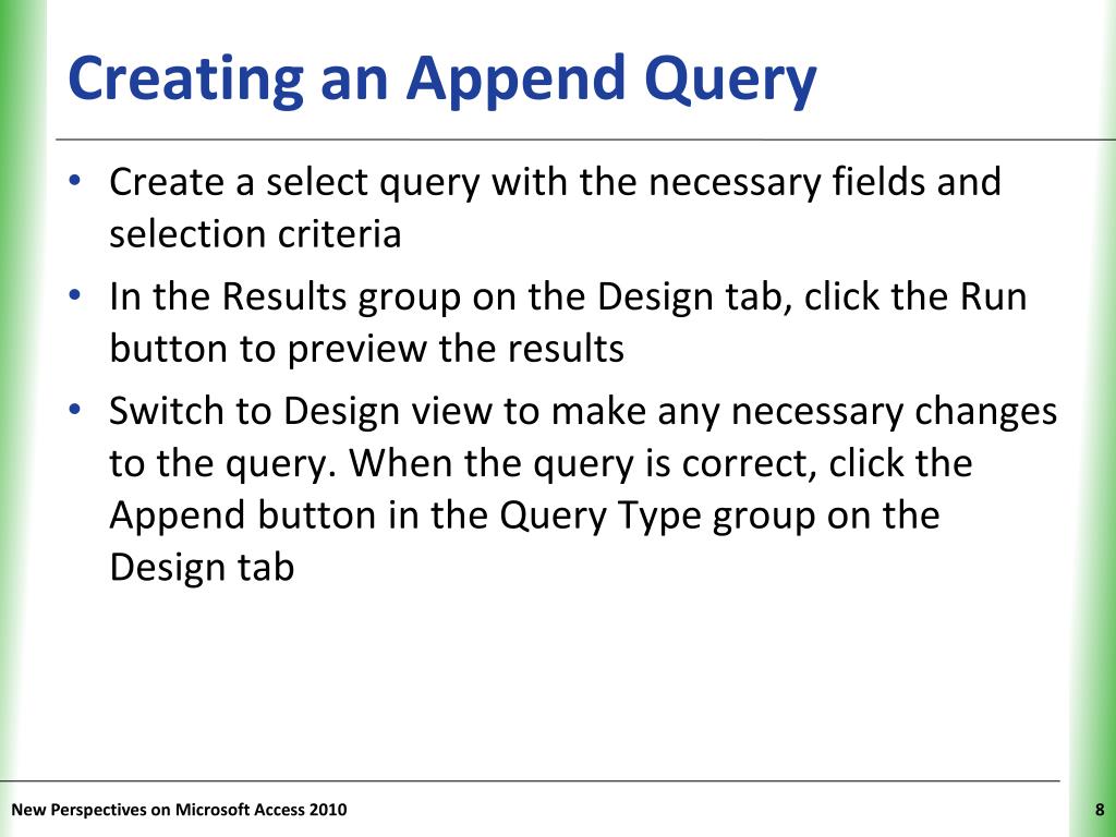 Creating an Append Query • Create a select query with the necessary fields and selection criteria • In the Results group on the Design tab, click the Run button to preview the results • Switch to Design view to make any necessary changes to the query. When the query is correct, click the Append button in the Query Type group on the Design tab New Perspectives on Microsoft Access 2010