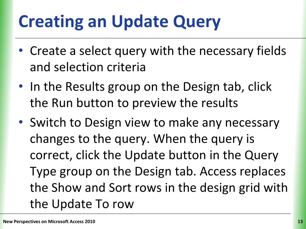 Creating an Update Query • Create a select query with the necessary fields and selection criteria • In the Results group on the Design tab, click the Run button to preview the results • Switch to Design view to make any necessary changes to the query. When the query is correct, click the Update button in the Query Type group on the Design tab. Access replaces the Show and Sort rows in the design grid with the Update To row New Perspectives on Microsoft Access 2010