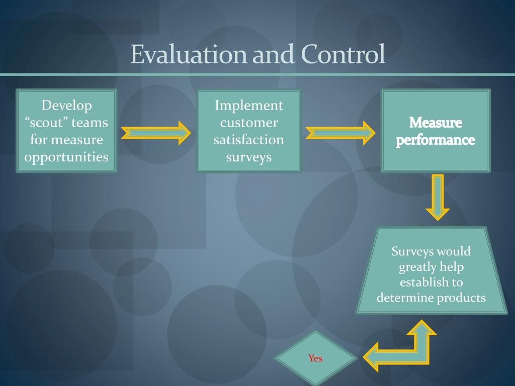 Evaluation and Control Develop “scout” teams for measure opportunities Implement customer satisfaction surveys Measure performance Surveys would greatly help establish to determine products Yes