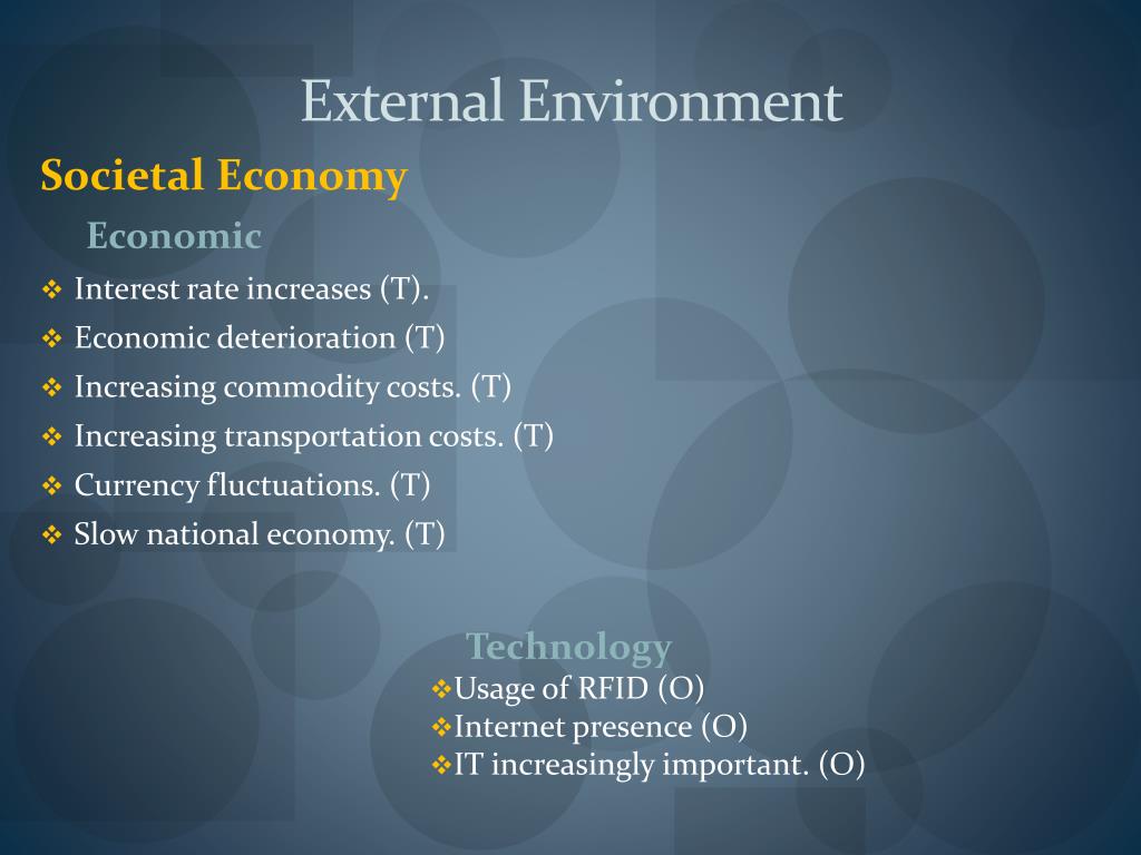 External Environment Societal Economy Economic • Interest rate increases (T). • Economic deterioration (T) • Increasing commodity costs. (T) • Increasing transportation costs. (T) • Currency fluctuations. (T) • Slow national economy. (T) Technology • Usage of RFID (O) • Internet presence (O) • IT increasingly important. (O)