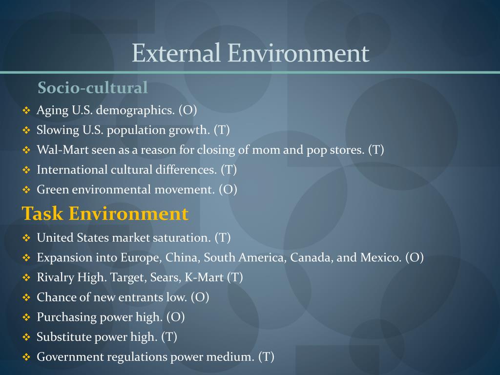External Environment Socio-cultural • Aging U.S. demographics. (O) • Slowing U.S. population growth. (T) • Wal-Mart seen as a reason for closing of mom and pop stores. (T) • International cultural differences. (T) • Green environmental movement. (O) Task Environment • United States market saturation. (T) • Expansion into Europe, China, South America, Canada, and Mexico. (O) • Rivalry High. Target, Sears, K-Mart (T) • Chance of new entrants low. (O) • Purchasing power high. (O) • Substitute power high. (T) • Government regulations power medium. (T)