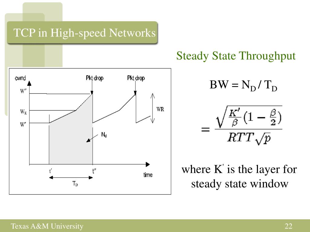 TCP in High-speed Networks Steady State Throughput BW = ND / TD where K' is the layer for steady state window
