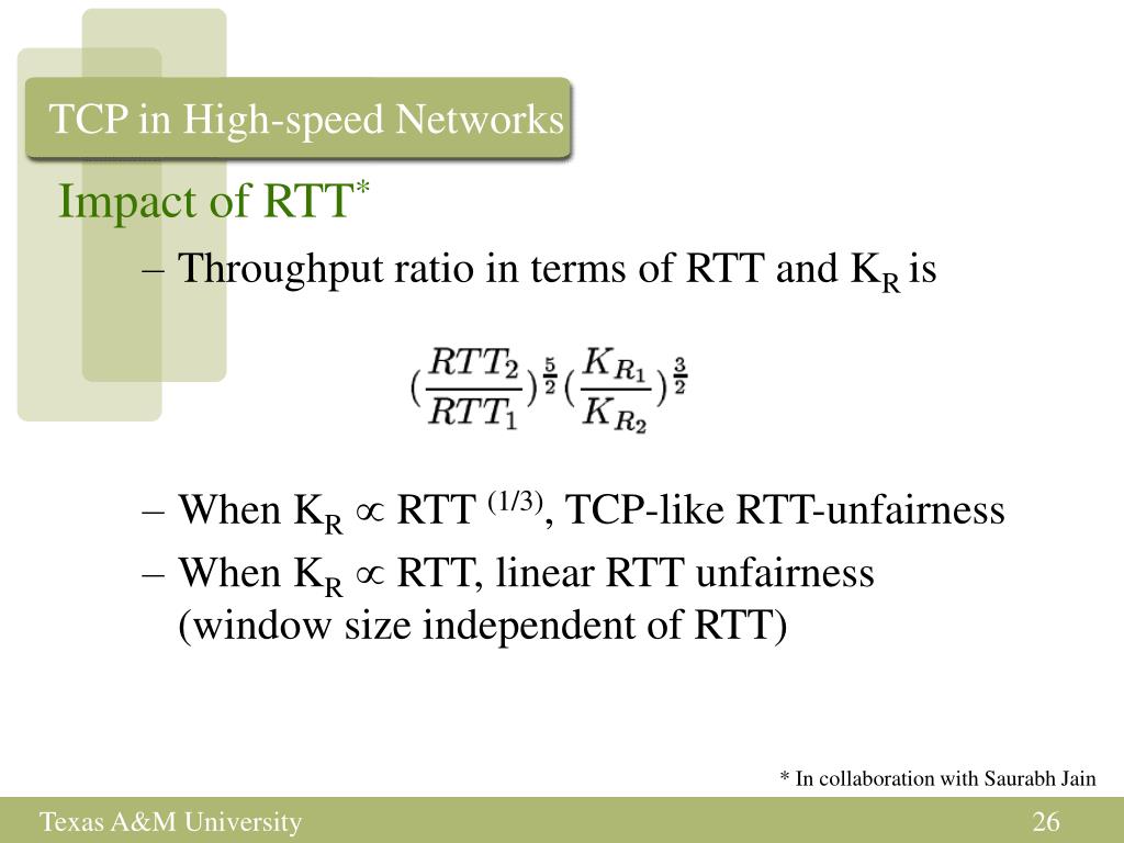 TCP in High-speed Networks Impact of RTT* • Throughput ratio in terms of RTT and KR is • When KR RTT (1/3), TCP-like RTT-unfairness • When KR RTT, linear RTT unfairness (window size independent of RTT) * In collaboration with Saurabh Jain