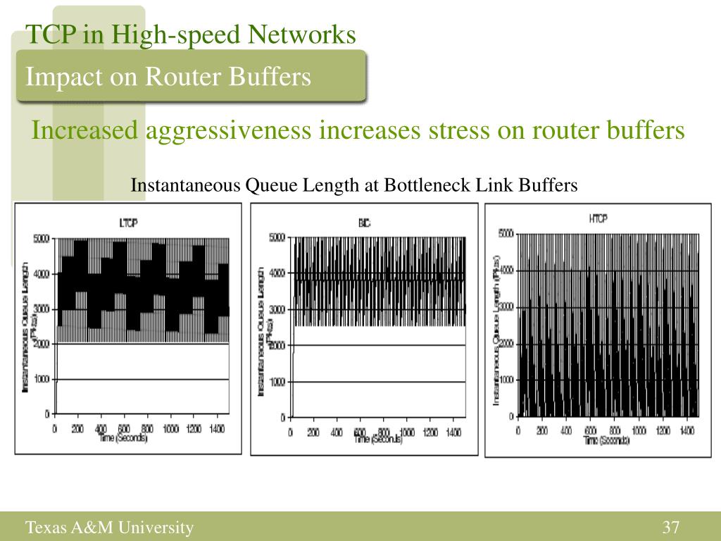 TCP in High-speed Networks Impact on Router Buffers Increased aggressiveness increases stress on router buffers Instantaneous Queue Length at Bottleneck Link Buffers