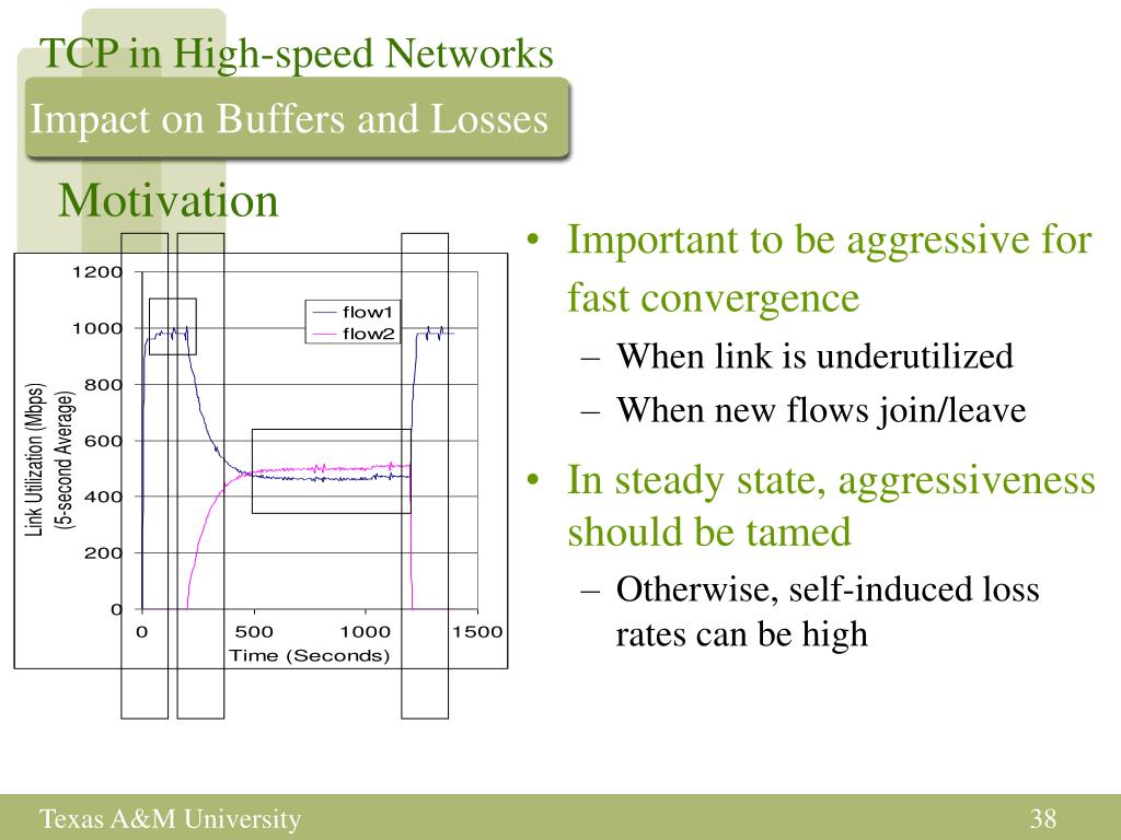 TCP in High-speed Networks Impact on Buffers and Losses Motivation • Important to be aggressive for fast convergence • When link is underutilized • When new flows join/leave • In steady state, aggressiveness should be tamed • Otherwise, self-induced loss rates can be high