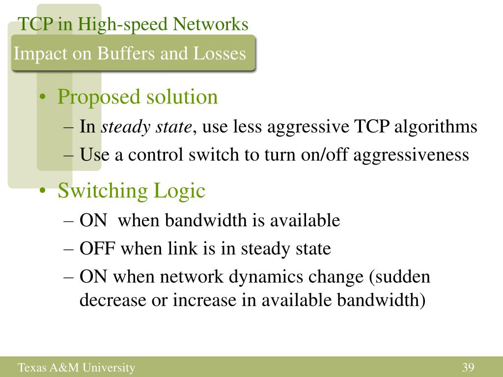 TCP in High-speed Networks Impact on Buffers and Losses • Proposed solution • In steady state, use less aggressive TCP algorithms • Use a control switch to turn on/off aggressiveness • Switching Logic • ON when bandwidth is available • OFF when link is in steady state • ON when network dynamics change (sudden decrease or increase in available bandwidth)