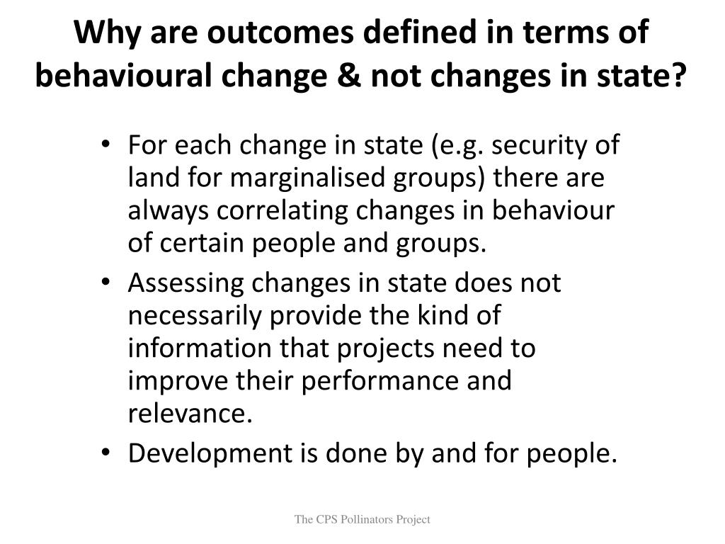 Why are outcomes defined in terms of behavioural change & not changes in state? For each change in state (e.g. security of land for marginalised groups) there are always correlating changes in behaviour of certain people and groups. Assessing changes in state does not necessarily provide the kind of information that projects need to improve their performance and relevance. Development is done by and for people. The CPS Pollinators Project