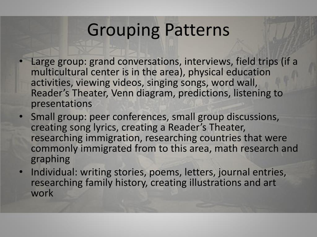 Grouping Patterns • Large group: grand conversations, interviews, field trips (if a multicultural center is in the area), physical education activities, viewing videos, singing songs, word wall, Reader’s Theater, Venn diagram, predictions, listening to presentations • Small group: peer conferences, small group discussions, creating song lyrics, creating a Reader’s Theater, researching immigration, researching countries that were commonly immigrated from to this area, math research and graphing • Individual: writing stories, poems, letters, journal entries, researching family history, creating illustrations and art work