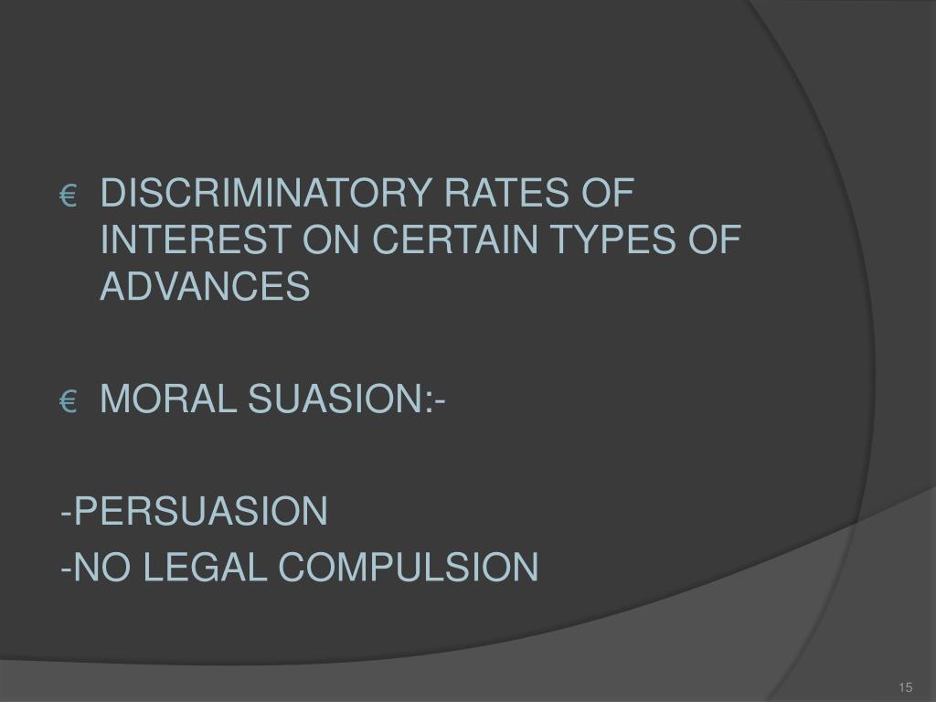DISCRIMINATORY RATES OF INTEREST ON CERTAIN TYPES OF ADVANCES • MORAL SUASION:- -PERSUASION -NO LEGAL COMPULSION