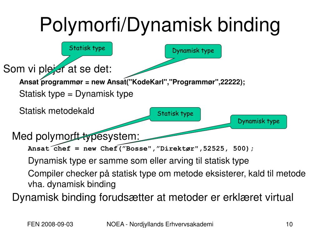 Polymorfi/Dynamisk binding Statisk type Dynamisk type Som vi plejer at se det: Ansat programmør = new Ansat("KodeKarl","Programmør",22222); Statisk type = Dynamisk type Statisk metodekald Statisk type Dynamisk type • Med polymorft typesystem: • Ansat chef = new Chef(”Bosse",”Direktør",52525, 500); • Dynamisk type er samme som eller arving til statisk type • Compiler checker på statisk type om metode eksisterer, kald til metode vha. dynamisk binding • Dynamisk binding forudsætter at metoder er erklæret virtual NOEA - Nordjyllands Erhvervsakademi