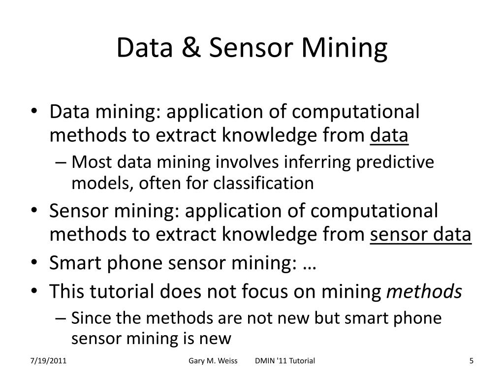 Data & Sensor Mining • Data mining: application of computational methods to extract knowledge from data • Most data mining involves inferring predictive models, often for classification • Sensor mining: application of computational methods to extract knowledge from sensor data • Smart phone sensor mining: … • This tutorial does not focus on mining methods • Since the methods are not new but smart phone sensor mining is new Gary M. Weiss DMIN '11 Tutorial