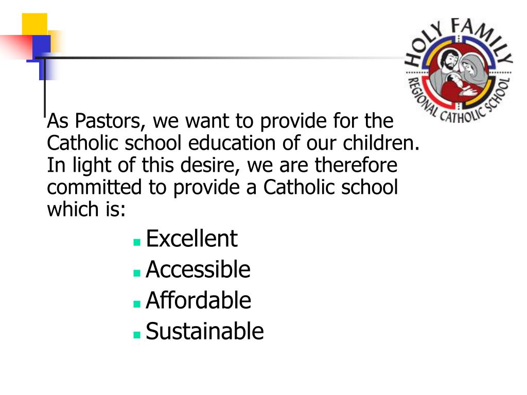 Welcome. As Pastors, we want to provide for the Catholic school education of our children. In light of this desire, we are therefore committed to provide a Catholic school which is: Excellent Accessible Affordable Sustainable. Topics to be Reviewed. Regional School Sources of Support