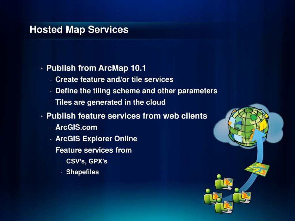 Hosted Map Services • Publish from ArcMap 10.1 • Create feature and/or tile services • Define the tiling scheme and other parameters • Tiles are generated in the cloud • Publish feature services from web clients • ArcGIS.com • ArcGIS Explorer Online • Feature services from • CSV’s, GPX’s • Shapefiles