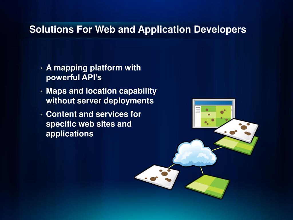 Solutions For Web and Application Developers • A mapping platform with powerful API’s • Maps and location capability without server deployments • Content and services for specific web sites and applications