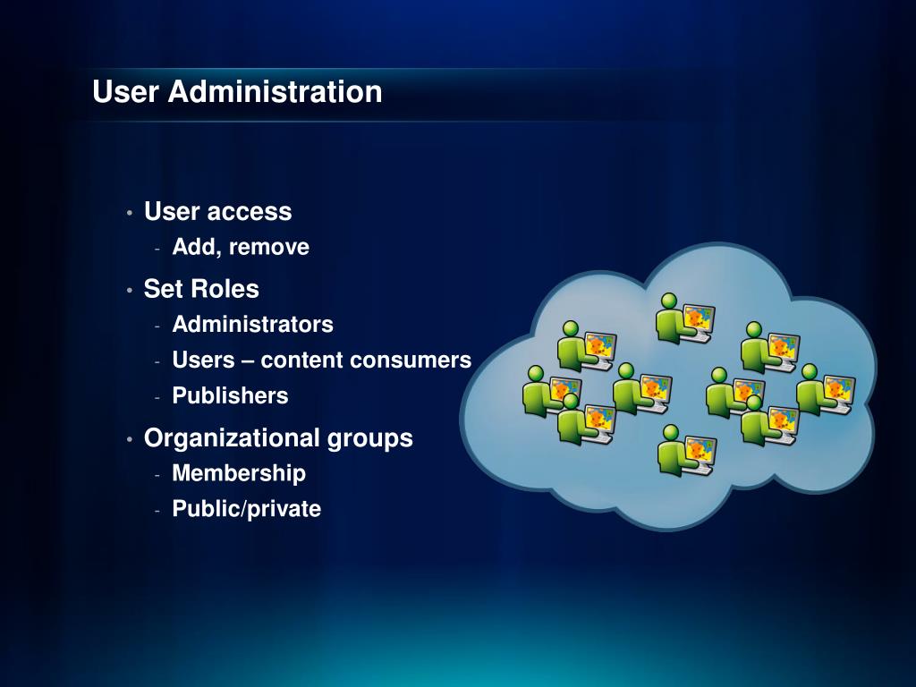 User Administration • User access • Add, remove • Set Roles • Administrators • Users – content consumers • Publishers • Organizational groups • Membership • Public/private