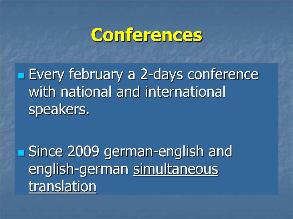 Conferences • Every february a 2-days conference with national and international speakers. • Since 2009 german-english and english-german simultaneous translation