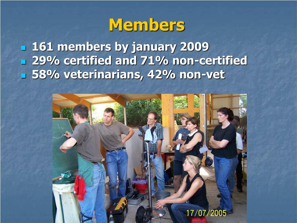 Members • 161 members by january 2009 • 29% certified and 71% non-certified • 58% veterinarians, 42% non-vet