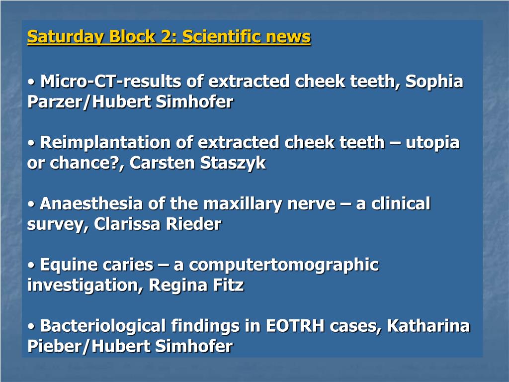 Saturday Block 2: Scientific news • Micro-CT-results of extracted cheek teeth, Sophia Parzer/Hubert Simhofer • Reimplantation of extracted cheek teeth – utopia or chance?, Carsten Staszyk • Anaesthesia of the maxillary nerve – a clinical survey, Clarissa Rieder • Equine caries – a computertomographic investigation, Regina Fitz • Bacteriological findings in EOTRH cases, Katharina Pieber/Hubert Simhofer
