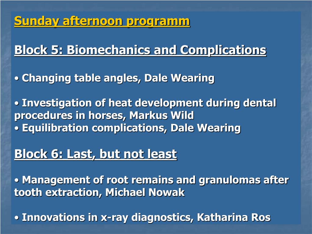 Sunday afternoon programm • Block 5: Biomechanics and Complications • Changing table angles, Dale Wearing • Investigation of heat development during dental procedures in horses, Markus Wild • Equilibration complications, Dale Wearing • Block 6: Last, but not least • Management of root remains and granulomas after tooth extraction, Michael Nowak • Innovations in x-ray diagnostics, Katharina Ros