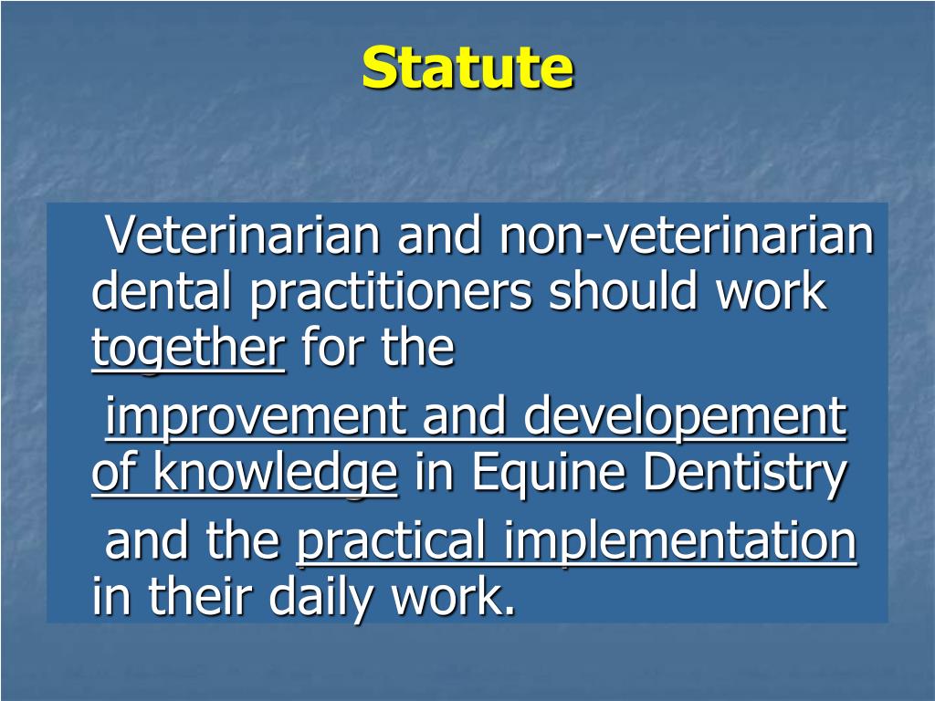 Statute Veterinarian and non-veterinarian dental practitioners should work together for the improvement and developement of knowledge in Equine Dentistry and the practical implementation in their daily work.