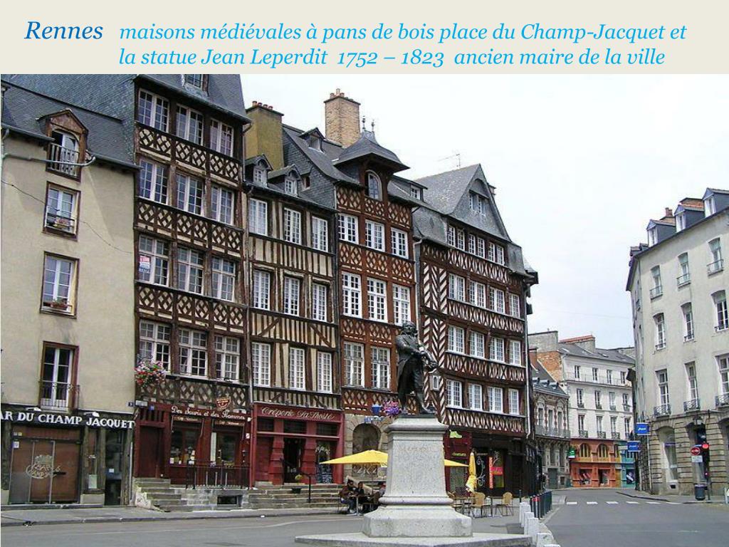 Rennes maisons médiévales à pans de bois place du Champ-Jacquet et . la statue Jean Leperdit 1752 – 1823 ancien maire de la ville