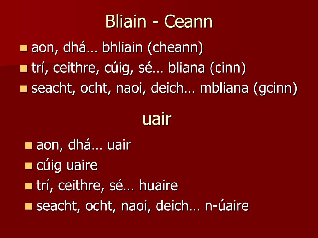 Bliain - Ceann • aon, dhá… bhliain (cheann) • trí, ceithre, cúig, sé… bliana (cinn) • seacht, ocht, naoi, deich… mbliana (gcinn) uair • aon, dhá… uair • cúig uaire • trí, ceithre, sé… huaire • seacht, ocht, naoi, deich… n-úaire