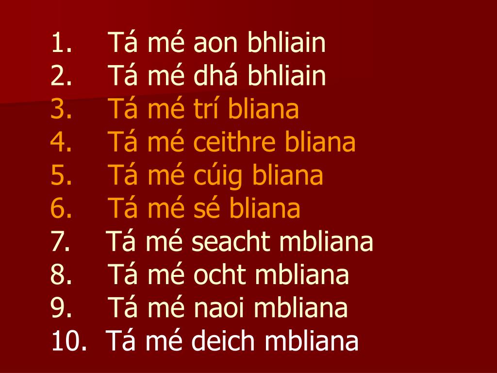 Tá mé aon bhliain • Tá mé dhá bhliain • 3. Tá mé trí bliana • 4. Tá mé ceithre bliana • 5. Tá mé cúig bliana • 6. Tá mé sé bliana • 7. Tá mé seacht mbliana • 8. Tá mé ocht mbliana • 9. Tá mé naoi mbliana • 10. Tá mé deich mbliana