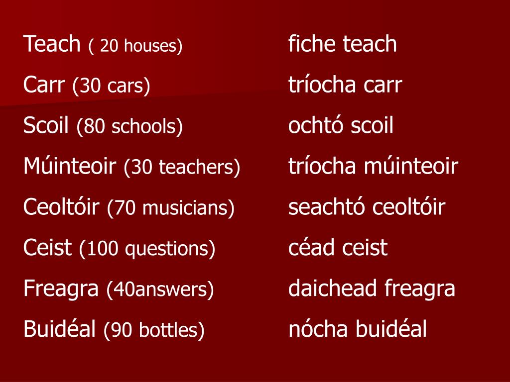Teach ( 20 houses) Carr (30 cars) Scoil (80 schools) Múinteoir (30 teachers) Ceoltóir (70 musicians) Ceist (100 questions) Freagra (40answers) Buidéal (90 bottles) fiche teach tríocha carr ochtó scoil tríocha múinteoir seachtó ceoltóir céad ceist daichead freagra nócha buidéal