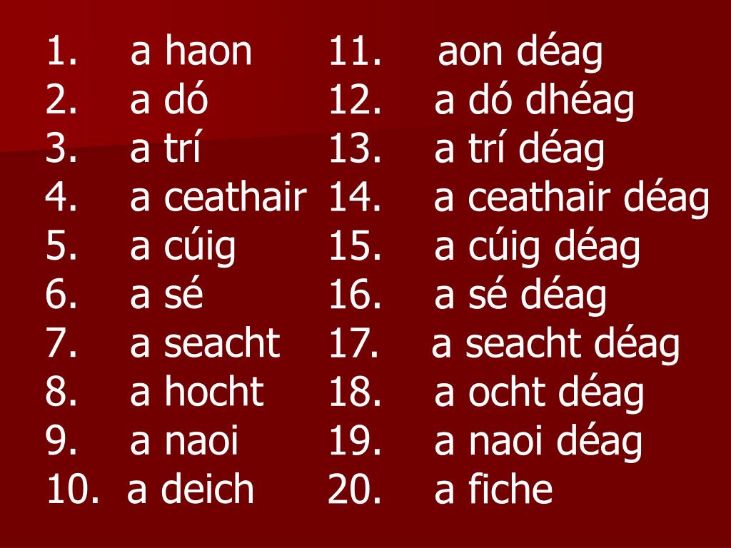 a haon • a dó • a trí • a ceathair • a cúig • a sé • a seacht • a hocht • a naoi • a deich 11. aon déag 12. a dó dhéag 13. a trí déag 14. a ceathair déag 15. a cúig déag 16. a sé déag 17. a seacht déag 18. a ocht déag 19. a naoi déag 20. a fiche