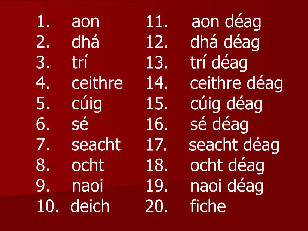 aon • dhá • trí • ceithre • cúig • sé • seacht • ocht • naoi • deich 11. aon déag 12. dhá déag 13. trí déag 14. ceithre déag 15. cúig déag 16. sé déag 17. seacht déag 18. ocht déag 19. naoi déag 20. fiche