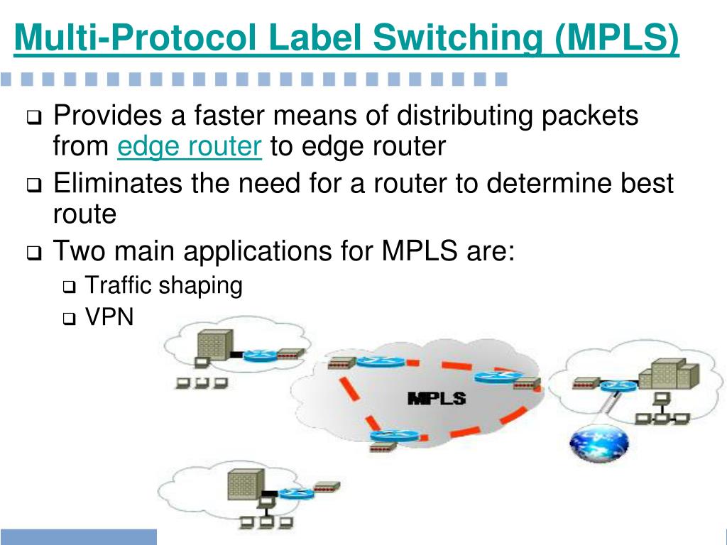Multi-Protocol Label Switching (MPLS) • Provides a faster means of distributing packets from edge router to edge router • Eliminates the need for a router to determine best route • Two main applications for MPLS are: • Traffic shaping • VPN