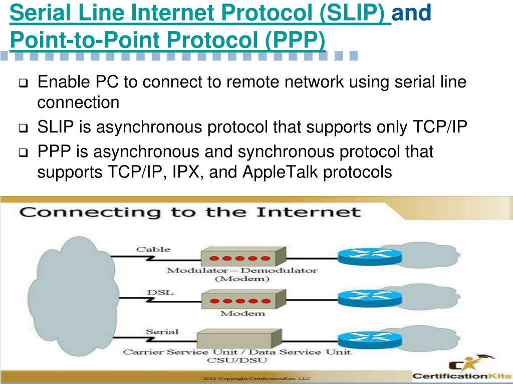 Serial Line Internet Protocol (SLIP)andPoint-to-Point Protocol (PPP) Enable PC to connect to remote network using serial line connection SLIP is asynchronous protocol that supports only TCP/IP PPP is asynchronous and synchronous protocol that supports TCP/IP, IPX, and AppleTalk protocols