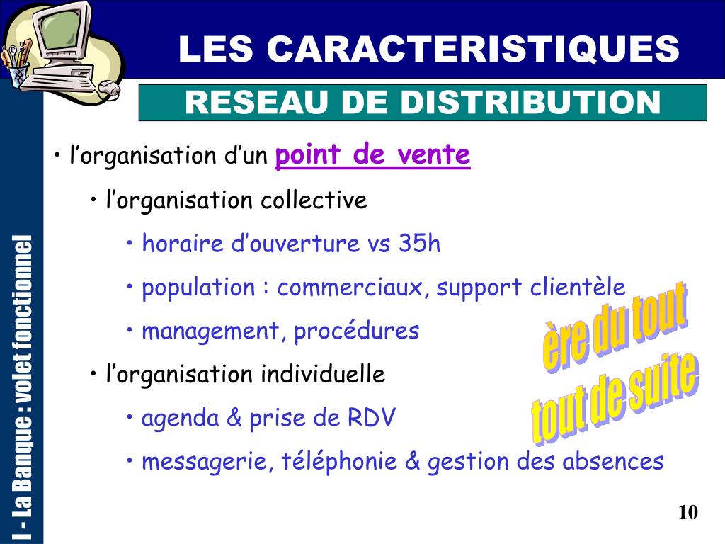 LES CARACTERISTIQUES I - La Banque : volet fonctionnel RESEAU DE DISTRIBUTION • l’organisation d’un point de vente • l’organisation collective • horaire d’ouverture vs 35h • population : commerciaux, support clientèle • management, procédures • l’organisation individuelle • agenda & prise de RDV • messagerie, téléphonie & gestion des absences ère du tout tout de suite