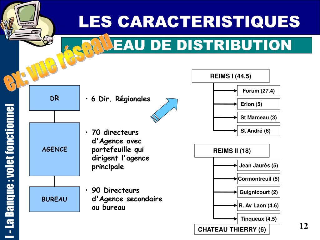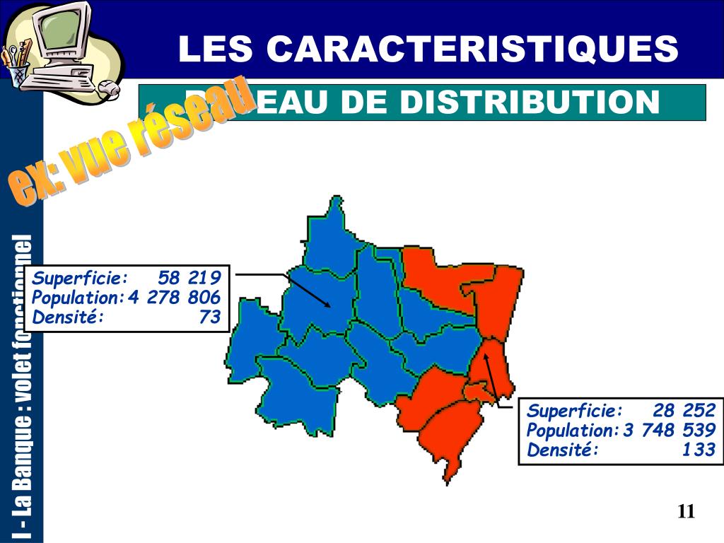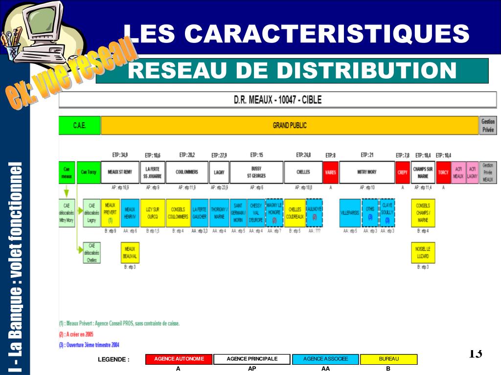 LES CARACTERISTIQUES I - La Banque : volet fonctionnel ex: vue réseau RESEAU DE DISTRIBUTION