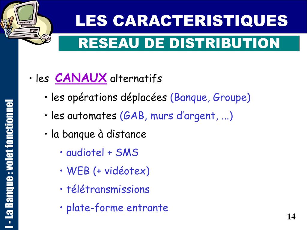 LES CARACTERISTIQUES I - La Banque : volet fonctionnel RESEAU DE DISTRIBUTION • les CANAUX alternatifs • les opérations déplacées (Banque, Groupe) • les automates (GAB, murs d’argent, ...) • la banque à distance • audiotel + SMS • WEB (+ vidéotex) • télétransmissions • plate-forme entrante