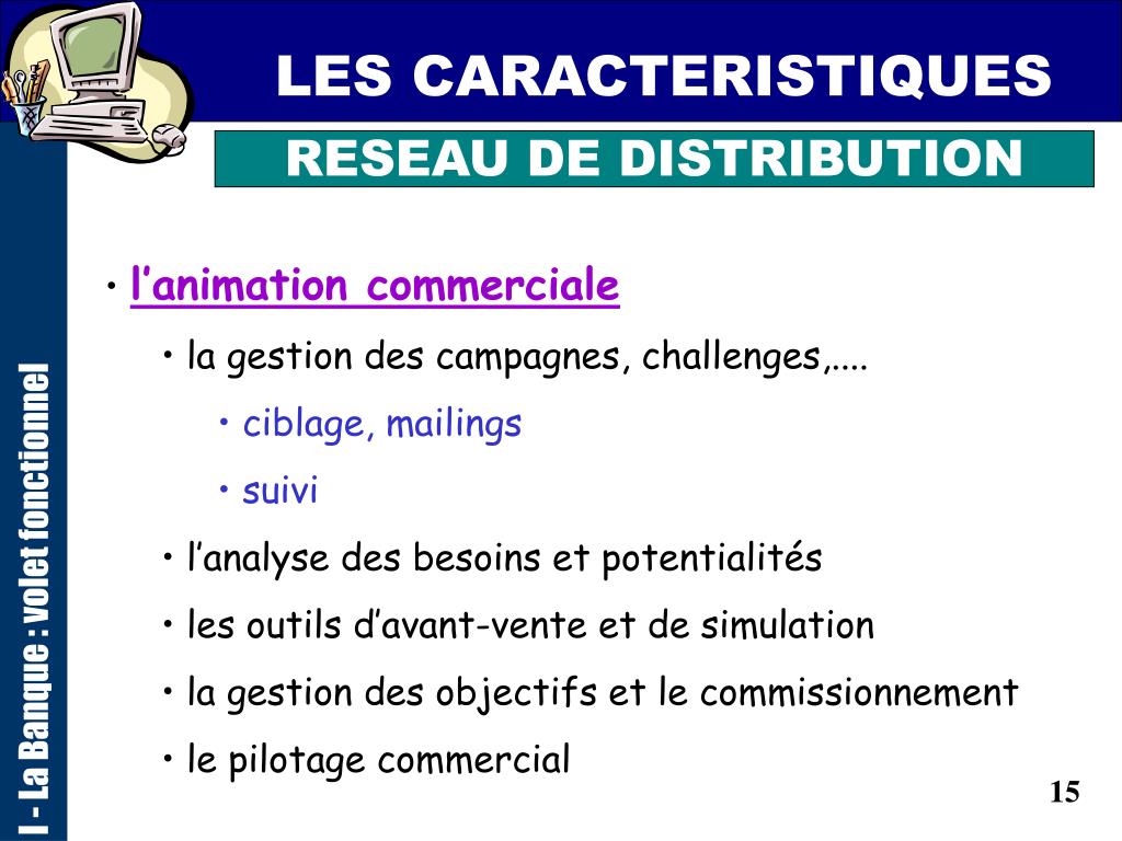 LES CARACTERISTIQUES I - La Banque : volet fonctionnel RESEAU DE DISTRIBUTION • l’animation commerciale • la gestion des campagnes, challenges,.... • ciblage, mailings • suivi • l’analyse des besoins et potentialités • les outils d’avant-vente et de simulation • la gestion des objectifs et le commissionnement • le pilotage commercial