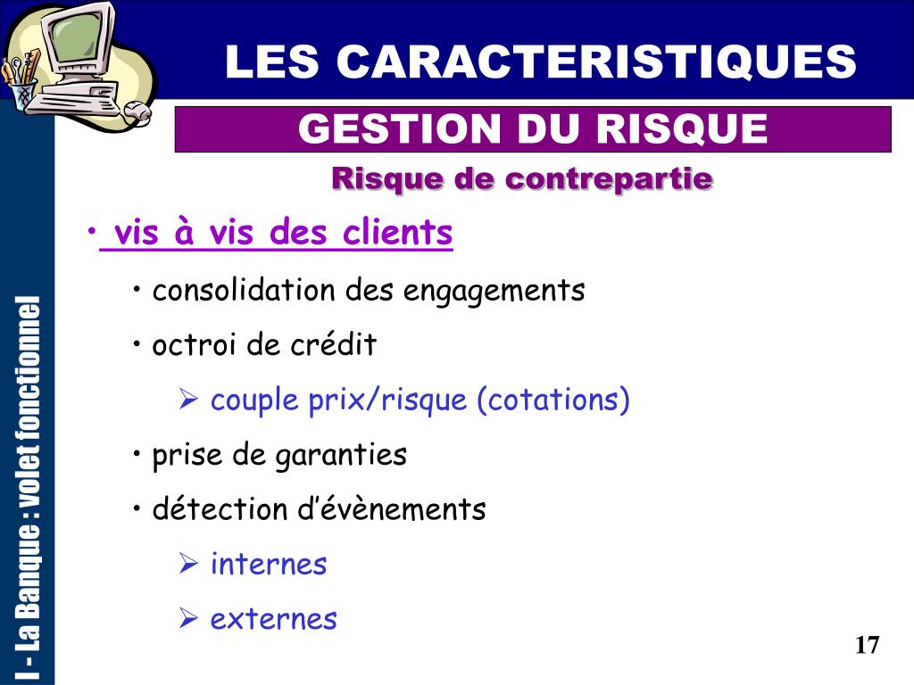 LES CARACTERISTIQUES I - La Banque : volet fonctionnel GESTION DU RISQUE Risque de contrepartie • vis à vis des clients • consolidation des engagements • octroi de crédit • couple prix/risque (cotations) • prise de garanties • détection d’évènements • internes • externes