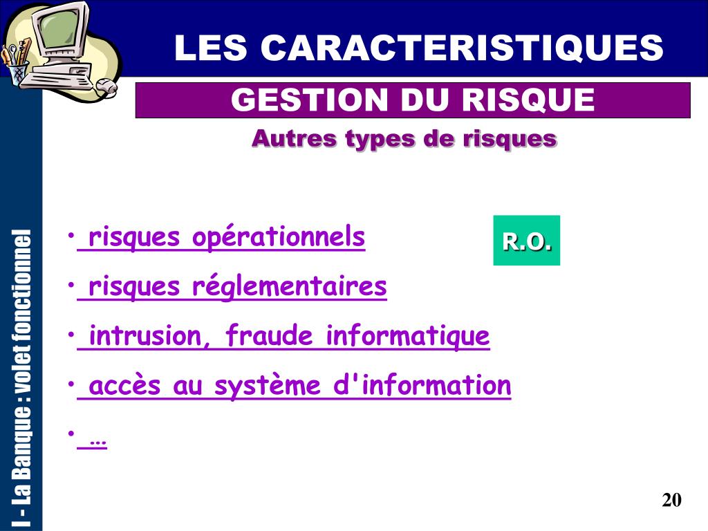 LES CARACTERISTIQUES I - La Banque : volet fonctionnel GESTION DU RISQUE Autres types de risques R.O. • risques opérationnels • risques réglementaires • intrusion, fraude informatique • accès au système d'information • …