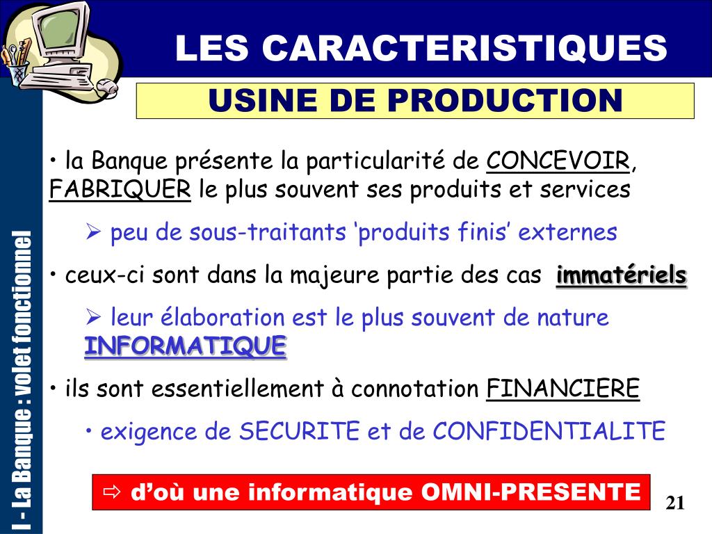 LES CARACTERISTIQUES I - La Banque : volet fonctionnel USINE DE PRODUCTION • la Banque présente la particularité de CONCEVOIR, FABRIQUER le plus souvent ses produits et services • peu de sous-traitants ‘produits finis’ externes • ceux-ci sont dans la majeure partie des cas immatériels • leur élaboration est le plus souvent de nature INFORMATIQUE • ils sont essentiellement à connotation FINANCIERE • exigence de SECURITE et de CONFIDENTIALITE • d’où une informatique OMNI-PRESENTE