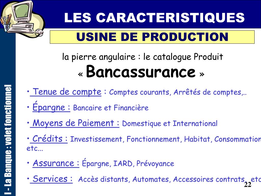LES CARACTERISTIQUES I - La Banque : volet fonctionnel USINE DE PRODUCTION • la pierre angulaire : le catalogue Produit « Bancassurance» • Tenue de compte : Comptes courants, Arrêtés de comptes,.. • Épargne :Bancaire et Financière • Moyens de Paiement :Domestique et International • Crédits :Investissement, Fonctionnement, Habitat, Consommation, etc... • Assurance :Épargne, IARD, Prévoyance • Services :Accès distants, Automates, Accessoires contrats, etc..