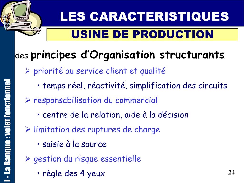 LES CARACTERISTIQUES I - La Banque : volet fonctionnel USINE DE PRODUCTION • des principes d’Organisation structurants • priorité au service client et qualité • temps réel, réactivité, simplification des circuits • responsabilisation du commercial • centre de la relation, aide à la décision • limitation des ruptures de charge • saisie à la source • gestion du risque essentielle • règle des 4 yeux