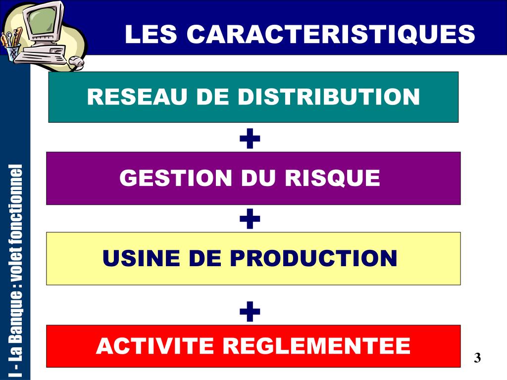 LES CARACTERISTIQUES I - La Banque : volet fonctionnel RESEAU DE DISTRIBUTION + GESTION DU RISQUE + USINE DE PRODUCTION + ACTIVITE REGLEMENTEE
