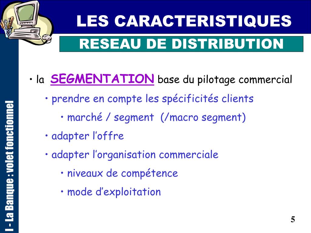 LES CARACTERISTIQUES I - La Banque : volet fonctionnel RESEAU DE DISTRIBUTION • la SEGMENTATION base du pilotage commercial • prendre en compte les spécificités clients • marché / segment (/macro segment) • adapter l’offre • adapter l’organisation commerciale • niveaux de compétence • mode d’exploitation