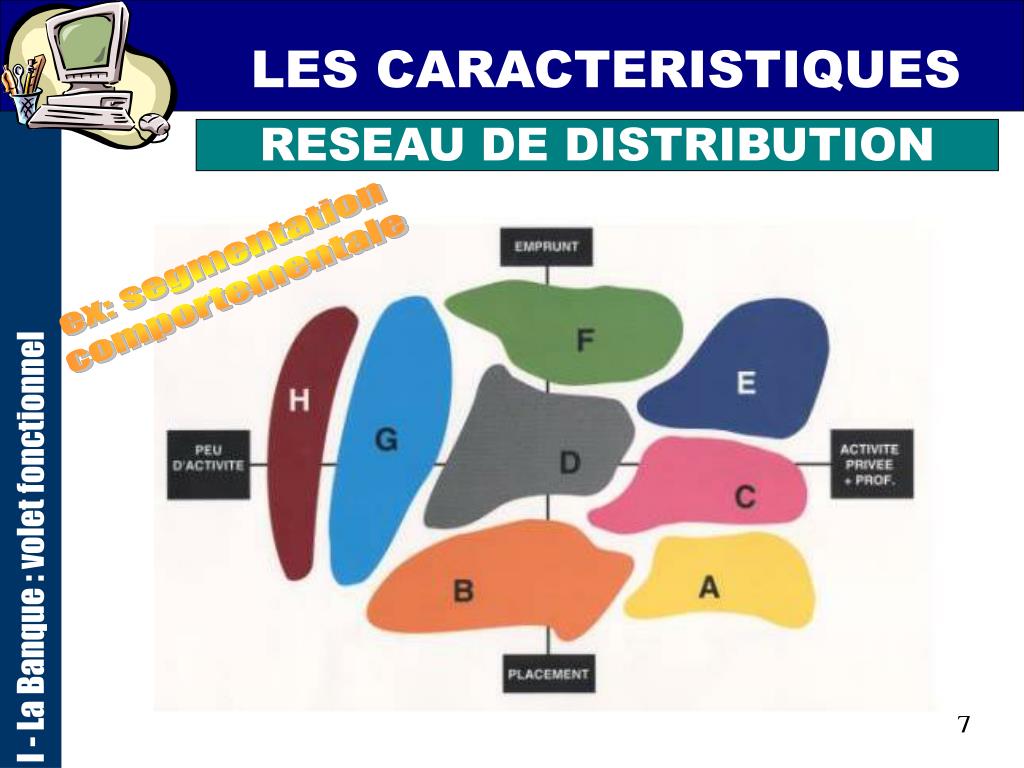 LES CARACTERISTIQUES I - La Banque : volet fonctionnel RESEAU DE DISTRIBUTION ex: segmentation comportementale