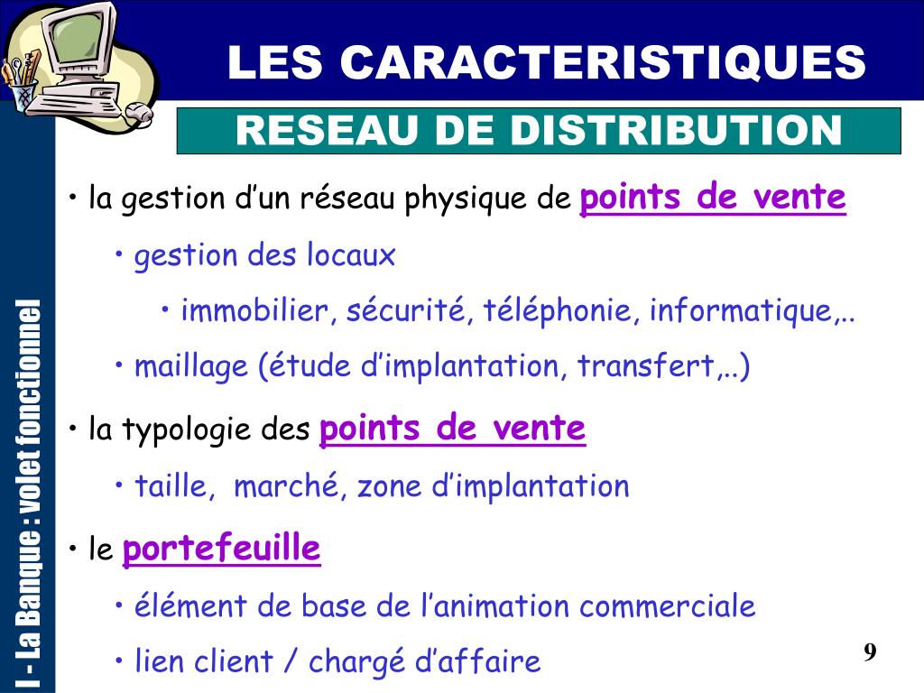 LES CARACTERISTIQUES I - La Banque : volet fonctionnel RESEAU DE DISTRIBUTION • la gestion d’un réseau physique de points de vente • gestion des locaux • immobilier, sécurité, téléphonie, informatique,.. • maillage (étude d’implantation, transfert,..) • la typologie des points de vente • taille, marché, zone d’implantation • le portefeuille • élément de base de l’animation commerciale • lien client / chargé d’affaire