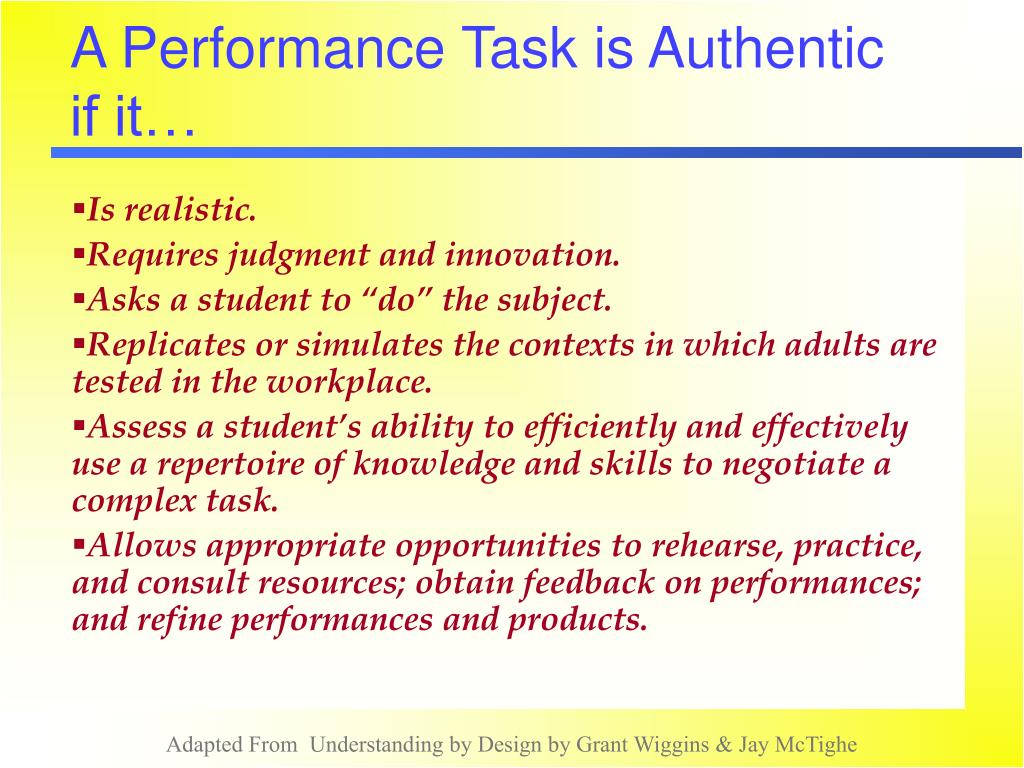 A Performance Task is Authentic if it… • Is realistic. • Requires judgment and innovation. • Asks a student to “do” the subject. • Replicates or simulates the contexts in which adults are tested in the workplace. • Assess a student’s ability to efficiently and effectively use a repertoire of knowledge and skills to negotiate a complex task. • Allows appropriate opportunities to rehearse, practice, and consult resources; obtain feedback on performances; and refine performances and products.