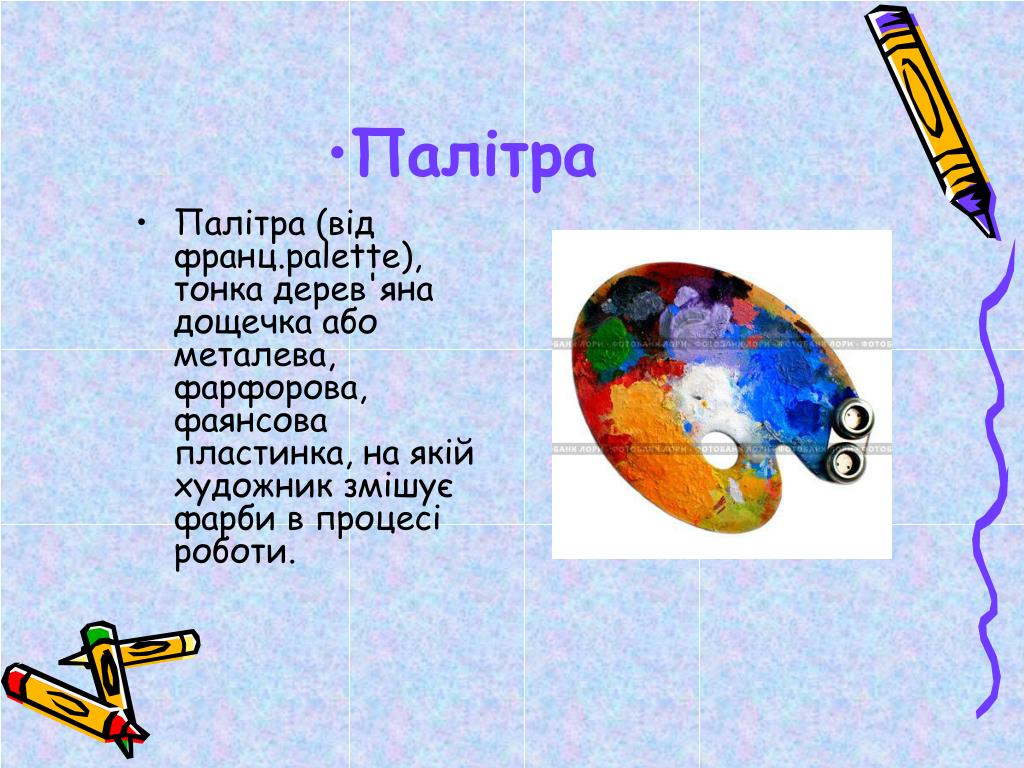 Палітра (від франц.palette), тонка дерев'яна дощечка або металева, фарфорова, фаянсова пластинка, на якій художник змішує фарби в процесі роботи. Палітра